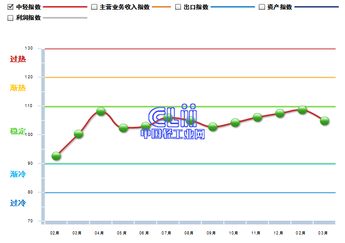 与中国缝制机械协会联合发布2014年3月中轻缝制机械行业景气指数。3月,中轻缝制机械行业景气指数为104.86,其中:主营业务收入景气指数为104.26,出口景气指数为109.04,资产景气指数为99.44,利润景气指数为111.67(图1)。