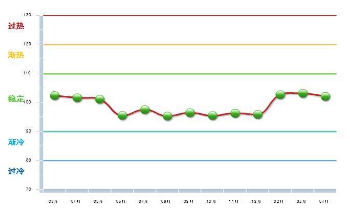 2014年4月中轻钟表景气指数为102.02,与去年同期相比增长0.42(参见图1-1)。中轻钟表景气指数继续呈现高位震荡前行态势。(参见图1-2)
