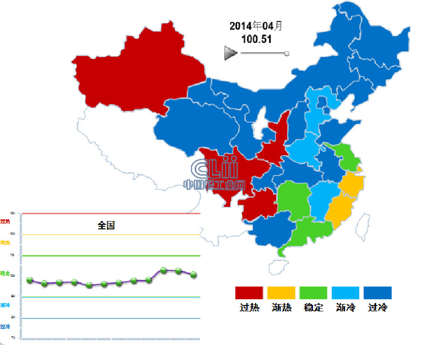 2014年2月,处于“稳定”区间的地区有3个,分别是:广东、江苏、湖南,占全国的9.68%。处于“过热”区间的地区有4个,分别是:新疆、陕西、四川、贵州。处于“渐冷”区间的地区有3个,分别是:河北、河南、江西。其它地区均处于过冷状态(不含西藏、云南、宁夏、海南)(图3)。