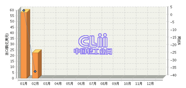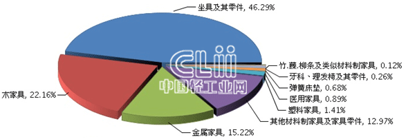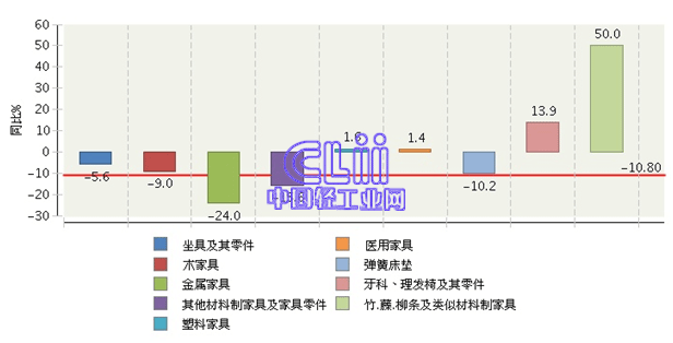 根据海关总署数据显示,2014年1~2月,我国累计出口家具在轻工主要商品出口中居第三位,占9.57%;由于受2013年同期套利贸易虚高的影响,家具出口值累计同比下降10.80%,比轻工主要商品的平均增长水平低了11.84个百分点。
