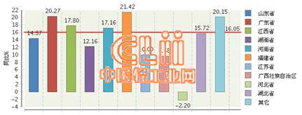 2014年1~5月全国陶瓷行业规模以上企业累计完成主营业务收入前三位地区依然是山东、广东、江西。其中山东累计完成主营业务收入同比增长14.37%,占17.27%;广东累计同比增长20.27%,占17.1%;江西省累计同比增长17.8%,占16.25%,详见图3。