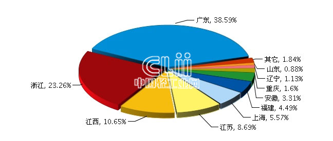 从出口地区来看,2014年1~6月,广东累计出口额0.72亿美元,占全国出口总额的38.59%,排在首位,排在第二位和第三位的是浙江和江西。