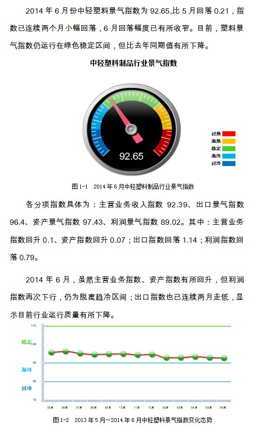 2014年8月4日, 发布《2014年6月中国塑料制品行业经济运行简报》,《简报》以国家统计局、海关总署的动态数据为基础,以中国轻工业经济运行及预测预警系统(www.qgysj.org/)为平台,紧密结合塑料制品行业运行基本情况,对行业经济运行态势加以分析研究。以下为简报摘要: