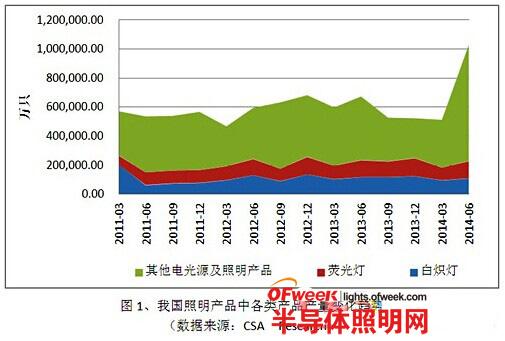 OFweek半导体照明网讯 2014年1-6月份,我国照明电器行业电光源产量达到139.6亿只,照明灯具及装置产量达到14.47亿台(套),分别同比增长5.2%和17.25%。其中白炽灯产量20.45亿只,荧光灯产量20.82亿只,同比下降9.28%和12.66%,因此包括LED照明产品在内的其他电光源及照明产品产量超过110亿只(套),大幅增长(如图1)。由此说明2014年上半年我国LED照明产品在全部照明产品中的比重正在快速提升。