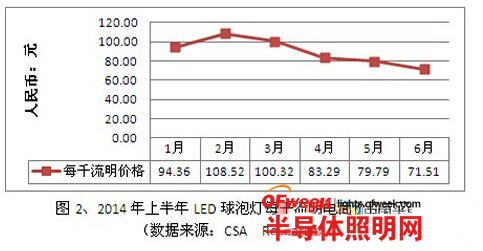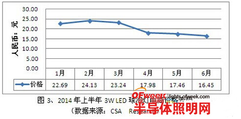根据对电商在售LED球泡灯的价格跟踪,2014年2季度,LED球泡灯价格继续降低,每千流明价格较1季度末降幅达到28.7%,其中3W球泡灯价格降幅更是超过29%,平均价格在16元人民币左右,包括佛照、欧普、勤上、洲明翰源、萤火虫等众多“大牌”的产品价格来到20元以下,越过价格甜蜜点,成为在网上热销的产品。