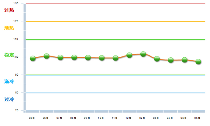 图1 2013.5—2014.6自行车行业产值景气指数变化态势