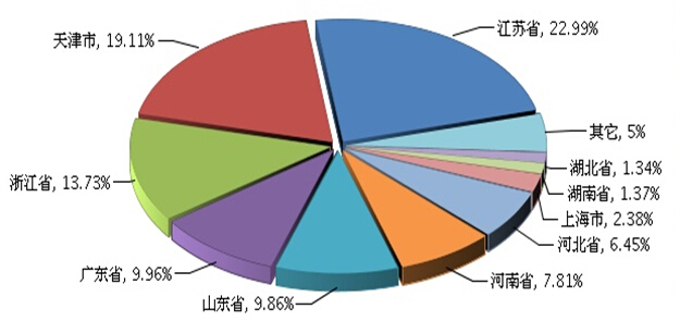 2014年1-6月份全国自行车行业下辖的两个子行业完成主营业务收入的状况是:脚踏自行车及残疾人座车制造行业累计完成主营业务收入317.75亿元,同比增长6.68%;助动自行车制造行业累计完成主营业务收入348.12亿元,同比增长12.03%。可以看到,自行车行业的主营业务收入增长放缓的原因主要是由助动自行车增速下降所影响的。 图3 2014年1~6月全国自行车行业累计主营业务收入地区占比情况