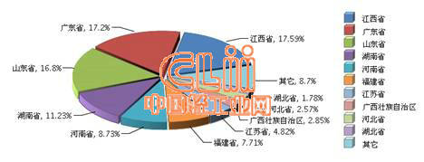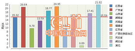 2014年1~6月全国陶瓷行业规模以上企业累计完成主营业务收入前三位地区依次是江西、广东、山东。其中江西累计完成主营业务收入同比增长15.32%,占17.59%;广东累计同比增长20.64%,占17.2%;山东累计同比增长9.78%,占16.8%,详见图2。