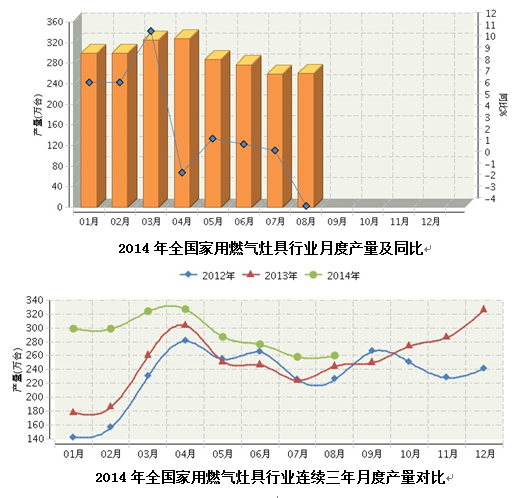 国家统计局数据显示,2014年1月~8月,全国家用燃气灶具累计完成产量同比增长1.82%,增速与上月相比略有下降。2014年二季度以来,出现产量逐月下降的走势。8月份产量环比略有增加,当月完成产量同比-3.88%,增速出现明显回落,并由正增长转为了负增长。(见图)