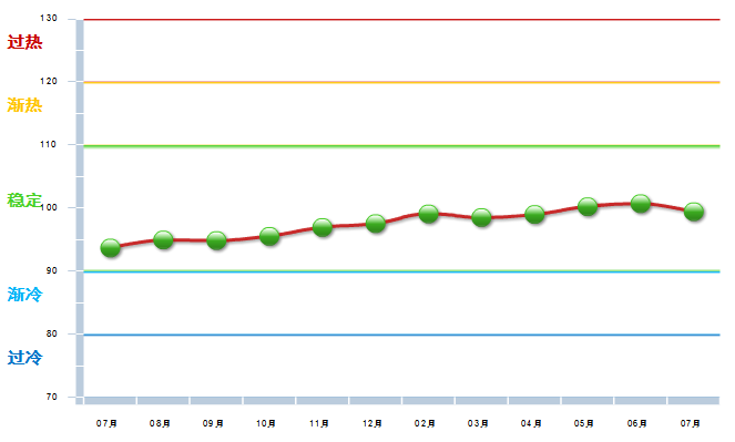 从中轻日化景气指数的走势来看,自去年7月以来成稳定回升态势,5、6两月重回稳定区间中位线附近,但7月小幅下降。