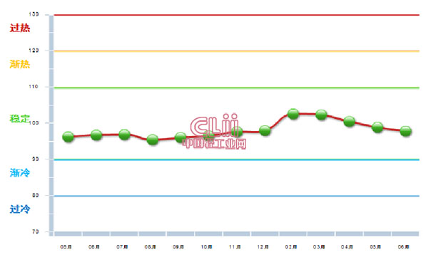 发布2014年6月中轻照明景气指数。6月,中轻照明景气指数97.82,其中:主营业务收入景气指数为96.66,出口景气指数为99.61,资产景气指数为97.69,利润景气指数为100.10(图1)。