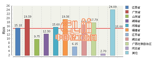 据国家统计局数据显示,2014年1~9月全国陶瓷行业规模以上企业累计完成主营业务收入前三位地区依次是江西、广东、山东。其中江西累计完成主营业务收入同比增长15.18%,占17.98%;广东累计同比增长19.39%,占16.64%;山东累计同比增长9.75%,占15.68%。详见图1。