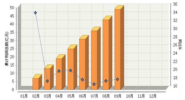图2 自行车行业月度累计利润总额走势图 2014年9月,自行车行业规模以上企业累计利润总额近49亿元,比去年同期增长18.5%。从子行业分布情况看,电动自行车行业虽然增速低于脚踏自行车行业,但利润已超过脚踏自行车行业,成为自行车行业新的盈利点。电动自行车行业累计利润总额达到31亿元,同比增长17.58%;脚踏自行车行业累计利润总额近18亿元,同比增长20.12%。