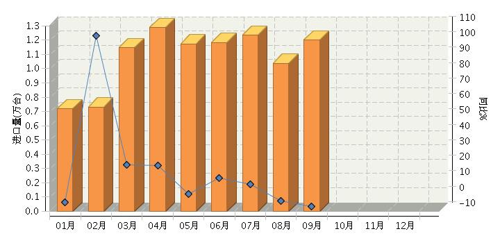 上图; 2014年1-9月我国钢琴进口量月度走势