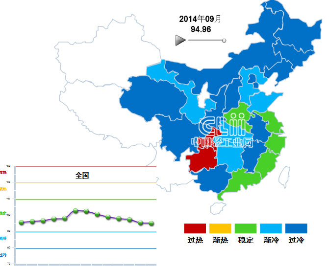 2014年9月,处于“稳定”区间的地区有5个,分别是:安徽、河南、浙江、福建和广东,占全国的16.13%。处于“过热”区间的地区有2个:重庆和贵州。处于“渐冷”区间的地区有5个,分别是:山东、河北、甘肃、湖南、湖北。其它地区均处于过冷状态(不含西藏、新疆、云南、宁夏、海南)(图3)。