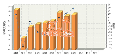 图 2014年1~9月我国陶瓷砖月度出口额及同比
