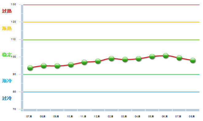 从中轻日化景气指数的走势来看,自2013年4月以来一直处于在“稳定”区间内的100基准线以下运行,该指数自2013年7月跌至最低值后,逐步缓慢回升至稳定区间中位线附近,今年6月升至100.73,13个月内首次重回100点,但三季度前两月持续下降,8月较6月下降2.75点。