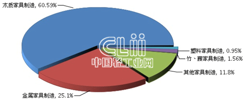 1~8月,家具子行业中木质家具制造业累计利润总额(下同)的占比达到60.59%,金属家具制造业占25.10%,其他家具制造业占11.80%,竹、藤家具制造业占1.56%,塑料家具制造业占0.95%(图4)。