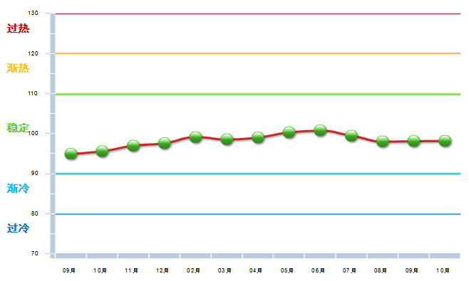 10月,贵州、山西、湖北、甘肃、湖南5省日化景气指数位于“过热”区间,占全国29个统计地区(下同)的17.2%;浙江、广东、天津等等10个地区位于“稳定”区间,占比34.5%;新疆、福建等7省位于“渐冷”区间,占24.1%;辽宁、云南、重庆等7个地区位于“过冷”区间,占24.1%。