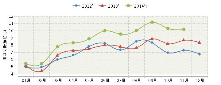 从月度走势看,今年8月份起已连续四个月月度出口交货值过10亿元。其中:8月份出口交货值10.05亿元,同比增长16.26%;9月份出口交货值11.19亿元,同比增长12.3%;10月份出口交货值10.33亿元,同比增长13.17%;11月份出口交货值10.2亿元,但同比增长速度明显降低,仅同比增长4.1%。