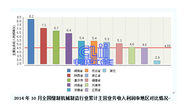 2014年1月~10月,全国缝制机械制造行业累计主营业务收入利润率为4.55%,同比增长-0.29%。其中,湖南省累计主营业务收入利润率为8.24%,同比增长-2.32%;陕西省累计主营业务收入利润率为7.1%,同比增长4.32%;重庆市累计主营业务收入利润率为6.74%,同比增长2.38%;河南省累计主营业务收入利润率为6.42%,同比增长-1.06%;安徽省累计主营业务收入利润率为5.44%,同比增长1.94%;河北省累计主营业务收入利润率为5.43%,同比增长-0.5%;浙江省累计主营业务收入利润率为5.3%,同比增长-0.05%;福建省累计主营业务收入利润率为5.12%,同比增长-0.29%;天津市累计主营业务收入利润率为4.64%,同比增长2.04%;江西省累计主营业务收入利润率为4.57%,同比增长-4.52%;其它累计主营业务收入利润率为2.91%,同比增长-1.05%。