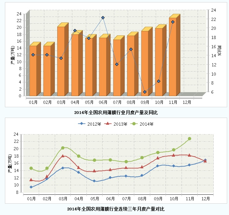 2014年1月~11月,全国农用薄膜行业累计完成产量201.09万吨,同比增长16.98%。其中:11月份完成产量22.82万吨,同比增长22.2%。
