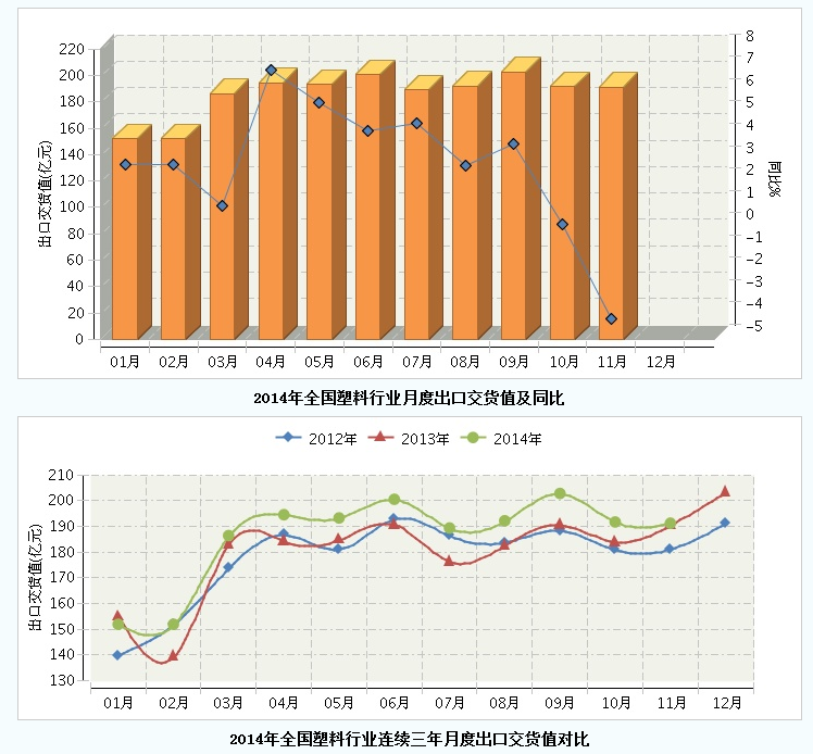2014年1月~11月,全国塑料行业累计完成出口交货值2,051.76亿元,同比增长3.02%。其中:11月份完成出口交货值191.25亿元,同比增长-4.08%。