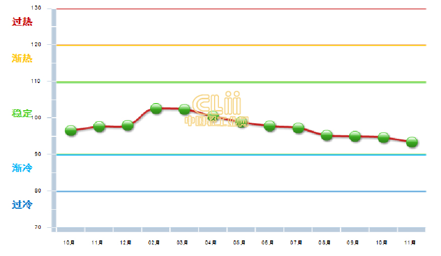2014年11月,处于“稳定”区间的地区有4个,分别是:福建、广东、江苏、浙江,占全国的12.90%。处于“过热”区间的地区有2个:贵州和甘肃,处于“渐冷”区间的地区有5个,分别是:陕西、河南、河北、山东和湖南。其它地区均处于过冷状态(不含西藏、新疆、云南、宁夏、海南)(图3)。