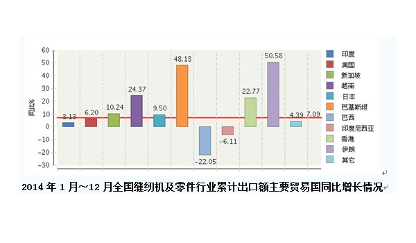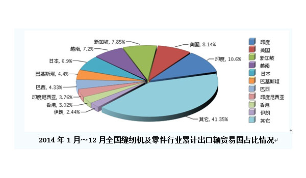 2014年1~12月,全国缝纫机及零件行业完成累计出口额21.61亿美元,同比增长7.09%。比重主要集中在印度、美国、新加坡、越南、日本、巴基斯坦、巴西、印度尼西亚、香港、伊朗等地区。