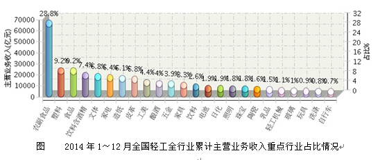 图 2014年1~12月全国轻工全行业累计主营业务收入重点行业同比增长情况