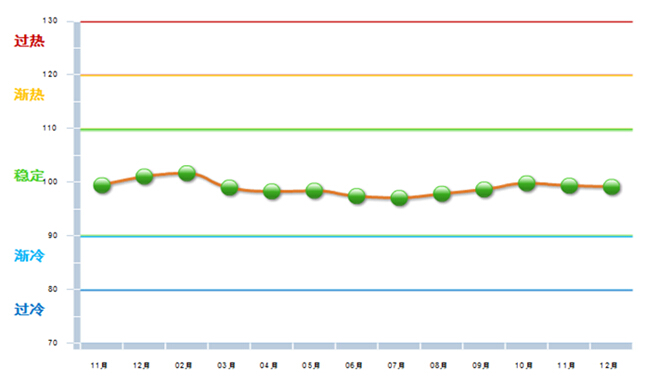 图1 2013.11—2014.12自行车行业主营业务收入景气指数变化态势