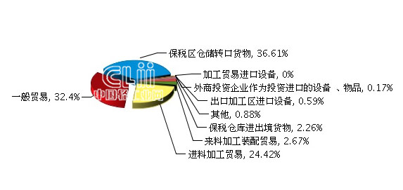 从进口贸易方式来看,保税区仓储转口货物完成累计进口额1.17亿美元(占36.61%),同比增长59.71%;一般贸易完成累计进口额1.03亿美元(占32.4%),同比增长-13.14%;进料加工贸易完成累计进口额0.78亿美元(占24.42%),同比增长-36.99%;来料加工装配贸易完成累计进口额0.08亿美元(占2.67%),同比增长-16.12%。
