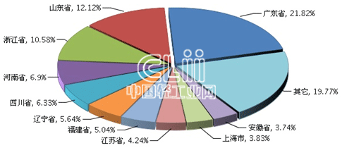 1~10月,家具行业累计主营业务收入居全国前10位的地区排名与1~9月相同;前10个地区的累计主营业务收入合计占比达到了80.23%。前三位地区中,广东的累计主营业务收入(下同)占21.82%,山东占12.12%,浙江占10.58%(图6)。