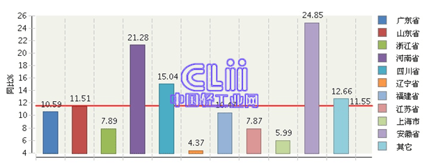同期,前10个地区中,河南和安徽的累计主营业务收入保持了21%以上的快速增长(下称“累计增速”);四川、山东、广东及福建4个地区的累计增速依旧超过了10%;浙江、江苏、上海及辽宁4个地区继续呈一位数增长(图7)。