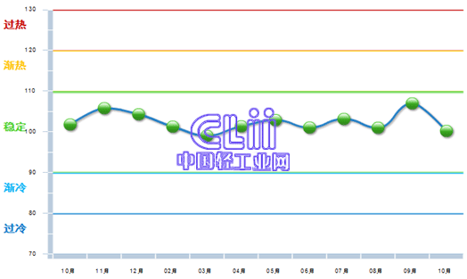 前10个月的出口景气指数表现出波浪式运行的特征,且基本处于接近或超过了100基准线;9~10月的震动较为明显,9月成为近年来的最高值,10月又现回落,比9月下降了6.79个百分点(图1)。