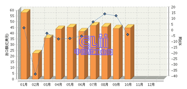 图2 2014年1~10月家具行业月度出口值及增速