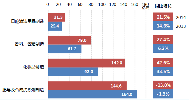 从2014年各日化子行业完成利润总额情况看:肥皂及合成洗涤剂制造完成累计利润总额占33%;化妆品制造完成累计利润总额占32.42%;香料、香精制造完成累计利润总额占18.04%;口腔清洁用品制造完成累计利润总额占7.14%。