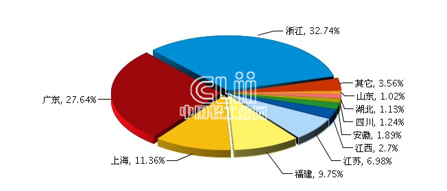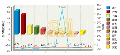 从出口省市来看,浙江、广东、上海、福建、江苏、江西、安徽、四川、湖北、山东、是出口额排在前十位的区域。其中:浙江累计出口额21.06亿美元,占全国出口总额的32.74%;广东累计出口额17.78亿美元,占全国出口总额的27.64%,同比增长-24.16%。