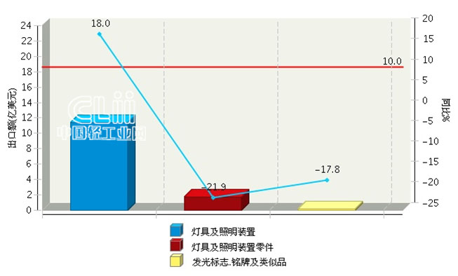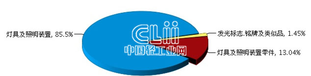 2014年,江苏照明灯具累计出口额13.32亿美元,同比增长10%。其中,灯具及照明装置完成累计出口额11.39亿美元(占85.5%),同比增长18.04%;灯具及照明装置零件完成累计出口额1.74亿美元(占13.04%),同比增长-21.91%;发光标志.铭牌及类似品完成累计出口额0.19亿美元(占1.45%),同比增长-17.77%。
