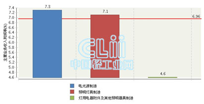 2014年,全国照明行业累计主营业务收入利润率为6.96%,高于轻工全行业平均主营业务收入利润率0.69个百分点。从行业小类比较来看,电光源制造累计主营业务收入利润率为7.3%,高于其它两类。