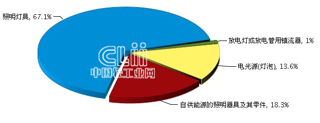 2014年,全国照明行业对印度累计出口额10.47亿美元,同比增长22.88%。其中,照明灯具累计出口额占行业出口总额的67.1%;自供能源的照明器具及其零件累计出口额占18.3%;电光源(灯泡)累计出口额占13.6%;放电灯或放电管用镇流器累计出口额占1%。