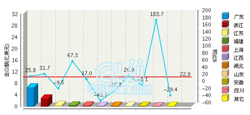 在我国对印度出口的省市中,广东、浙江、江苏是出口额居前三位的地区,其中广东累计出口额占全国出口总额的61.69%,在地区出口增速方面,四川、福建、浙江是出口增速前三甲,其中四川的出口增速达183.73%,超过全国平均增速160.85个百分点。