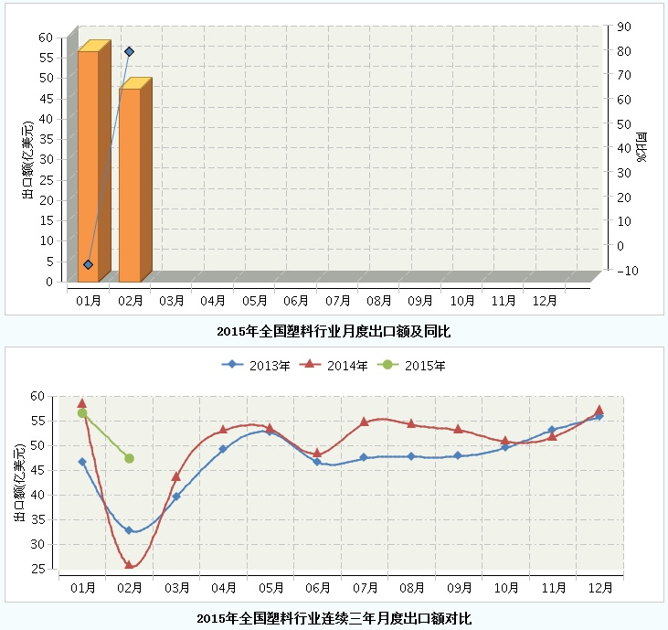 中国轻工业经济运行及预测预警系统数据显示:2015年1月~2月,全国塑料制品行业累计完成出口额103.98亿美元,同比增长23.6%。其中:2月份完成出口额同比增长84.2%,出口增幅较1月份大幅回升。