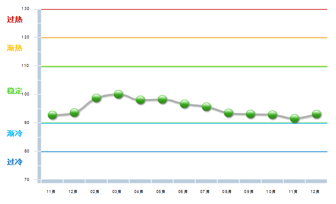 工艺美术利润景气指数自2013年10月进入稳定发展区域,到2014年3月达到最高100.04然后开始回落,到2014年11已连续7个月下降,12月开始回升。
