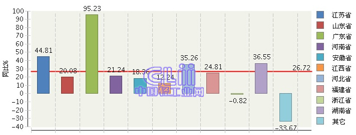 从地区分布来看,1-2月全国玩具行业利润创收比重主要集中在江苏省、山东省、广东省、河南省、安徽省、江西省、河北省、福建省、浙江省、湖南省等地区。其中广东省完成累计利润总额1.16亿元,同比增长95.23%,是全国玩具行业利润增长最快的省区。(见图2)