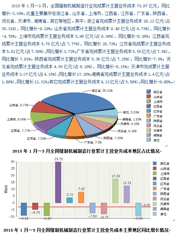 2015年3月江西缝制机械制造行业累计主营业务成本同比上升29.73%