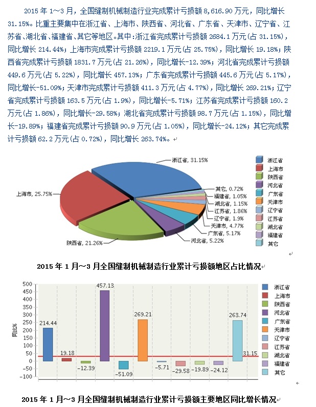 2015年1~3月全国缝制机械制造行业河北累计亏损额增速最快