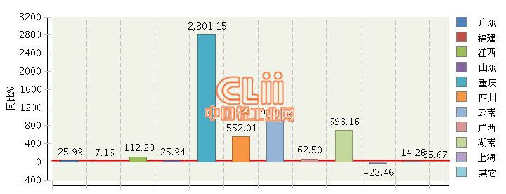 2015年一季度我国陶瓷砖出口主要地区中重庆、云南、湖南、四川、江西出口额同比大幅提高,同比增长均达一倍以上;陶瓷砖出口额位居第二的福建同比增长7.16%,增速远低于全国平均水平;上海为唯一负增长的地区,出口额同比下降23.46%,详见图2。