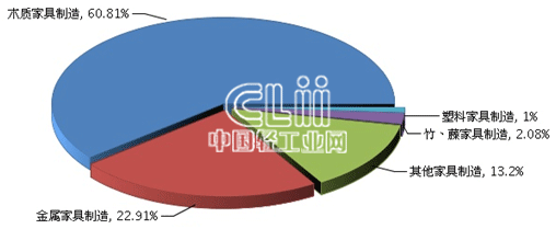 2014年,家具子行业中木质家具制造业累计利润总额(下同)的占比达到60.81%,金属家具制造业占22.91%,其他家具制造业占13.20%,竹、藤家具制造业占2.08%,塑料家具制造业占1.00%(图4)。