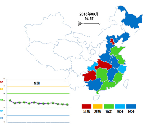 3月,北京、天津、贵州、湖北、四地区属于“过热”区间,与上去相比,增加了北京、天津、贵州;山东、江苏、福建、广西4个沿海省区以及湖南地区处于 “稳定”区间;浙江、重庆省区属于“渐冷”区间;“过冷”区间的地区数量是8个,分别是黑龙江、辽宁、河北、河南、安徽、江西、广西、上海。 (参见图1-3)
